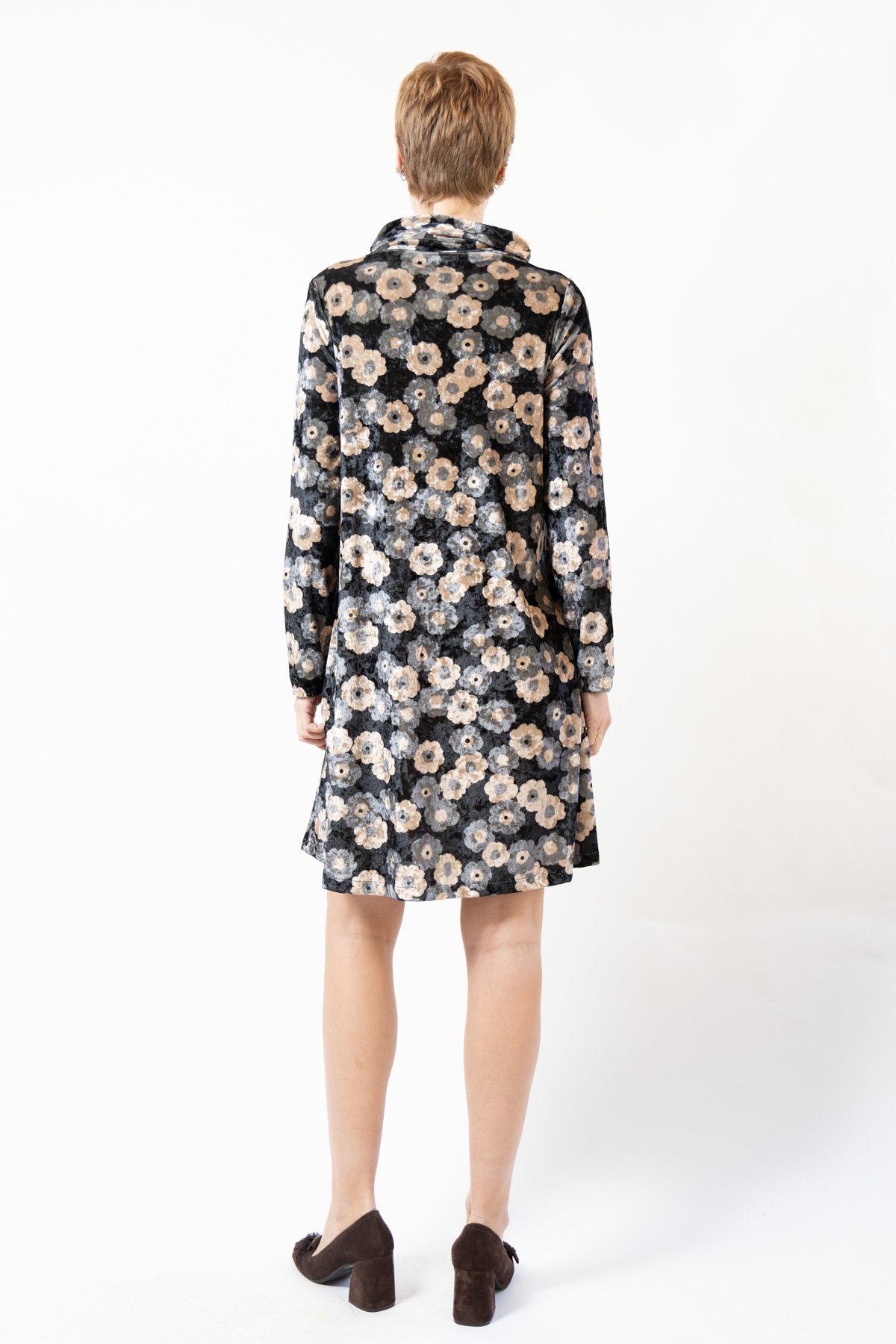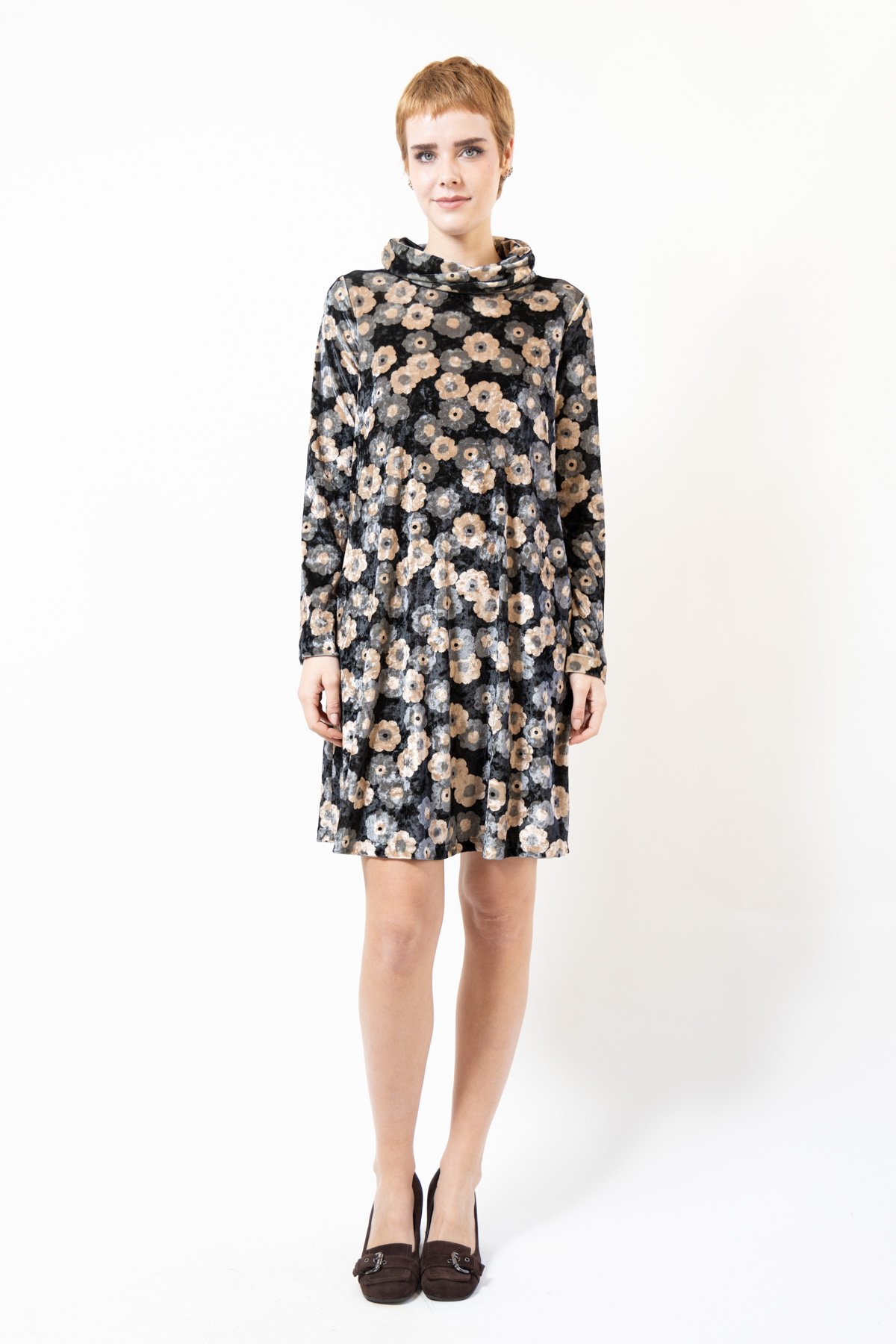 Abito GLENDA, manica lunga, over, scollo alto morbido, flower stretch velvet