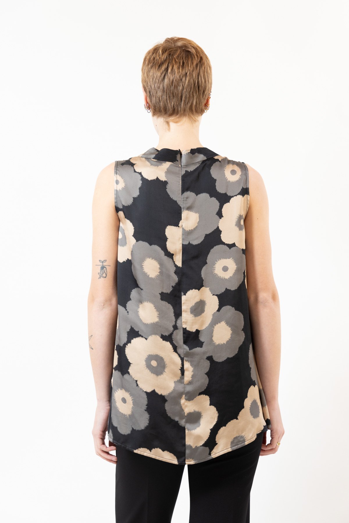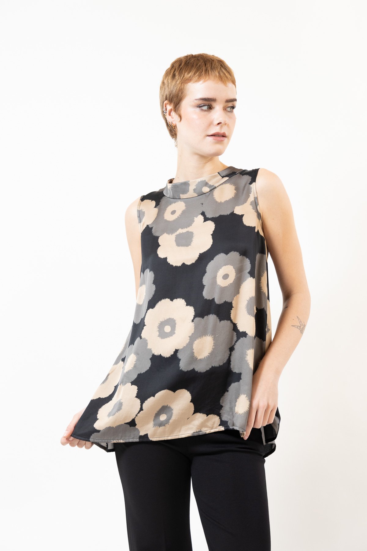 Top CARISMATICA senza maniche, collo cratere, macro flower satin