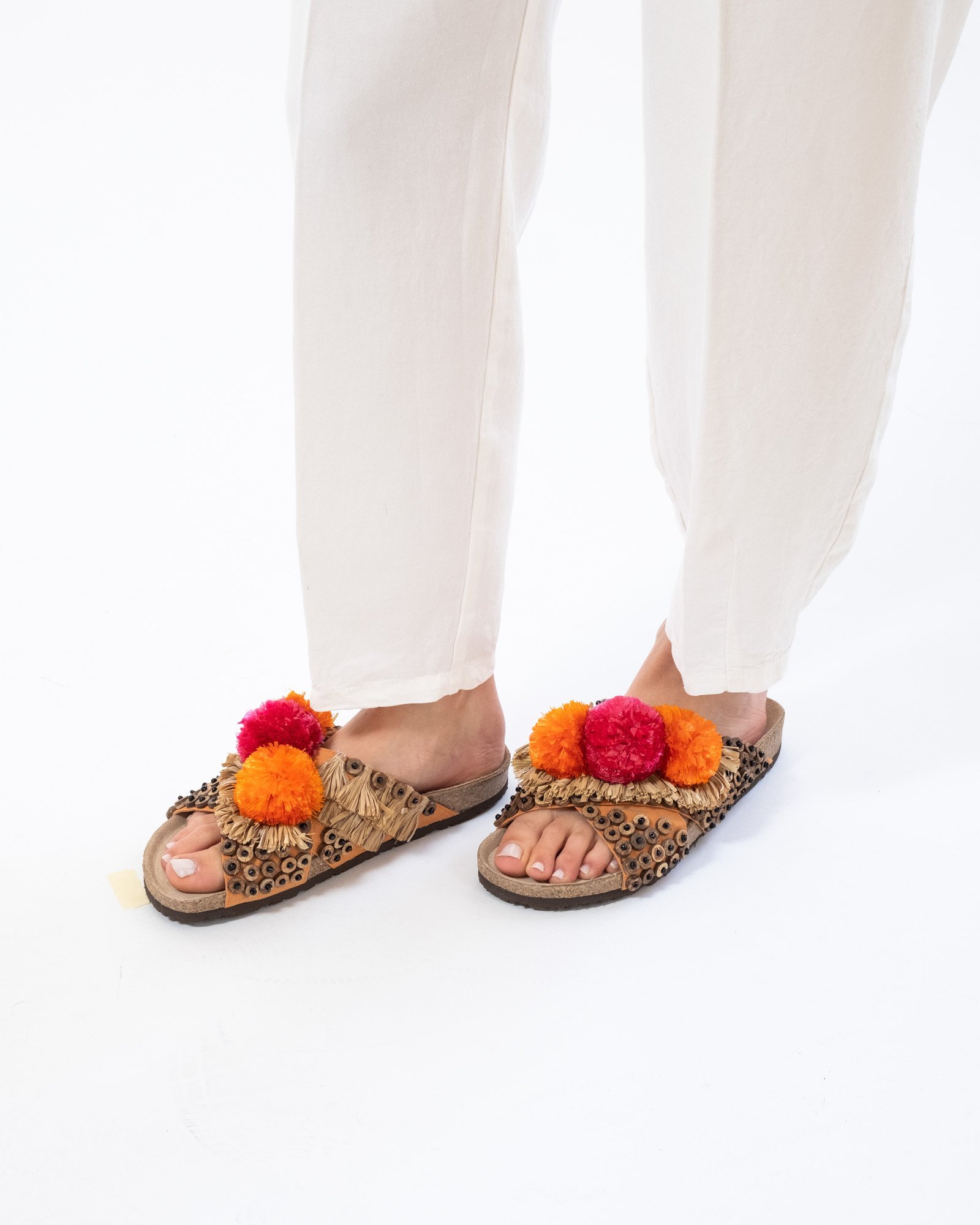 birkenstock INFRABIJOUX RAFIA CROCHET borchie e legno con 3 pon pon